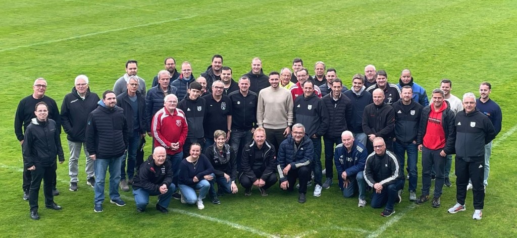 Auf dem Bild Ehrungen für 10 Jahre: Josip Pfadt, Rene Umbs, Björn Strack. Ehrungen 20 Jahre: Christian Gleich, Norbert Kiefer, Udo Marx. Gewinner Danke Schiri: U-50 Dirk Lang und Ü-50 Johannes Schäfer